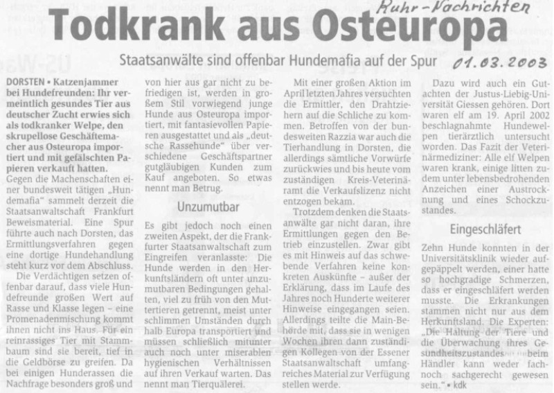 (Kdk) Dorsten Katzenjammer bei Hundefreunden: Ihr vermeintlich gesundes Tier aus deutscher Zucht erwies sich als todkranker Welpe, den skrupellose Geschäftemacher aus Osteuropa importiert und mit gefälschten Papieren verkauft hatten. Gegen die Machenschaften einer bundesweit tätigen „Hundemafia“ sammelt derzeit die Staatsanwaltschaft Frankfurt Beweismaterial. Eine Spur führte auch nach Dorsten, das Ermittlungsverfahren gegen eine dortige Hundehandlung steht kurz vor dem Abschluss. Die Verdächtigen setzen offenbar darauf, dass viele Hundefreunde großen Wert auf Rasse und Promenadenmischung kommt ihnen nicht ins Haus. Für ein reinrassiges Tier mit Stammbaum sind sie bereit, tief in die Tasche zu greifen. Da bei einigen Hunderassen die Nachfrage besonders groß und von hier aus gar nicht zu befriedigen ist, werden in großem Stil vorwiegend junge Hunde aus Osteuropa importiert, mit fantasievollen Papieren ausgestattet und als „deutsche Rassehunde“ über verschiedene Geschäftspartner gutgläubigen Kunden zum Kauf angeboten. So etwas nennt man Betrug. UnzumutbarEs gibt jedoch noch einen zweiten Aspekt, der die Frankfurter Staatsanwaltschaft zum Eingreifen veranlasste: Die Hunde werden in ihren Herkunftsländern oft unter unzumutbaren Bedingungen gehalten, viel zu früh von den Muttertieren getrennt, meist unter schlimmen Umständen durch halb Europa transportiert und müssen schließlich auch noch unter miserablen hygienischen Verhältnissen auf ihren Verkauf warten. Das nennt man Tierquälerei. Mit einer großen Aktion im April letzten Jahres versuchten die Ermittler, den Drahtziehern auf die Schliche zu kommen. Betroffen war auch die Tierhandlung in Dorsten, die allerdings sämtliche Vorwürfe zurückwies und bis heute vom zuständigen Kreisveterinäramt die Verkaufslizenz nicht entzogen bekam. Trotzdem denken die Staatsanwälte gar nicht daran, ihre