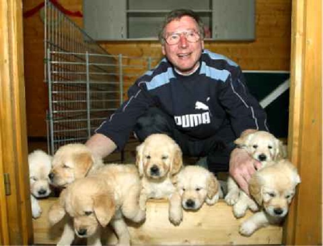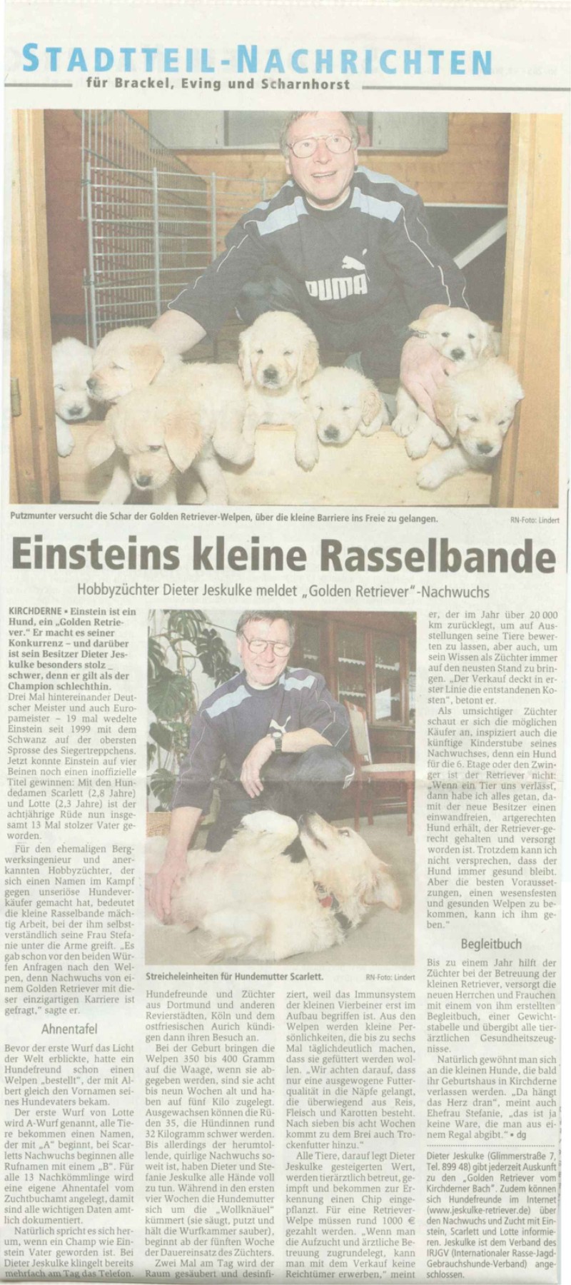 (Dg) Kirchderne Einstein ist ein Hund, ein „Golden Retriever“. Er macht es seiner Konkurrenz – und darüber ist sein Besitzer Dieter Jeskulke besonders stolz – schwer, denn er gilt als der Champion schlechthin. Drei mal hintereinander Deutscher Meister und auch Europameister – 19 mal wedelte Einstein seit 1999 mit dem Schwanz auf der obersten Sprosse des Siegertreppchens. Jetzt konnte Einstein auf vier Beinen noch einen inoffiziellen Titel gewinnen. Mit den Hundendamen Scarlett (2,8 Jahre) und Lotte (2,3 Jahre) ist der achtjährige Rüde nun insgesamt 13 mal stolzer Vater geworden. Für den ehemaligen Bergwerksingeniuer und anerkannten Hobbyzüchter, der sich einen Namen im Kampf gegen unseriöse Hundeverkäufer gemacht hat, bedeutet die kleine Rasselbande mächtig Arbeit, bei der ihm selbstverständlich seine Frau Stefanie unter die Arme greift. „Es gab schon vor den beiden Würfen Anfragen nach den Welpen, denn Nachwuchs von einem Golden Retriever mit dieser einzigartigen Karriere ist gefragt,“ sagt er. Ahnentafel Bevor der erste Wurf das Licht der Welt erblickte, hatte ein Hundefreund schon einen Welpen „bestellt“, der mit Albert gleich den Vornamen seines Hundevaters bekam. Der erste Wurf von Lotte wird A-Wurf genannt,