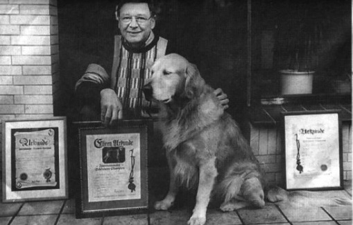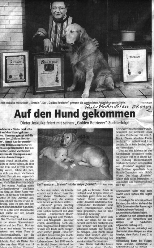 (Dg) Kirchderne - Dieter Jeskulke ist auf den Hund gekommen. Genauer gesagt auf die Rasse der "Golden Retriever". Heute hat der pensionierte Bergbauingenieur einen ausgezeichneten Ruf als Züchter, seine Vierbeiner glänzen als Champions auf vielen Ausstellungen. Einen Hund anschaffen, das wollte er immer schon, da aber seine Frau und er voll berufstätig waren, fehlte die Zeit, um sich um einen Vierbeiner ("Mein Favorit war eigentlich ein Boxer") kümmern zu können. Nach dem Berufsende sah er bei einem Ausflug einen "Golden Retriever" - und hatte sein Herz an diese Rasse verloren. In der Nähe von Bottrop suchte er eine Adresse auf, doch schnell machte er die Erfahrung, dass es sich hier um einen Hundehändler handelte, dem es unter dem Deckmantel einer Zucht nur um Absatz und Gewinn ging. Das Thema Hund kam wieder bei einem Spessart-Aufenthalt auf den Tisch. Dort erfuhr er aus seinem Verwandtenkreis von einer Frau in Mönchengladbach, die die Rasse seriös und mit viel Liebe züchtete. Und als Dieter Jeskulke aus dem Wurf von 13 Welpen den Rüden "Einstein" in den Arm nahm, da konnte er noch nicht ahnen, dass dieser kleine Vierbeiner ein Glücksgriff war, der einmal sein Leben verändern sollte. "Einstein" gedieh prächtig und Dieter Jeskulke, der heute eine Liebhaberzucht mit dem Namen "Kirchderner Bach" betreibt, zog mit dem Vierbeiner - aus Neugierde - zu einer ersten Ausstellung nach Aurich. Wegen eines Formfehlers wurde der Rüde nicht Sieger, aber seither glänzt "Einstein" auf allen Ausstellungen, macht seiner Hundekonkurrenz das Leben schwer. Seit 1999 wurde er 16 mal Sieger, fünfmal belegte er den zweiten Platz und dreimal gab es Bronze. Auch in Holland und Belgien stand er mehrfach ganz oben auf dem Podest. Dieter Jeskulke ist stolz: "Einstein ist dreimal hintereinander Deutscher und auch Internationaler Champion geworden, das ist eine einmalige Leistung". Der Kirchderner setzt sich heute vor allem für die Sauberkeit unter den Züchtern ein und wendet viel Energie auf, schwarze Schafe zur Strecke zu bringen. "Die Zucht muss seriös und sauber sein", so lautet die Hauptforderung des anerkannten Fachmannes. Wer Dieter Jeskulke heute fragt, wie er